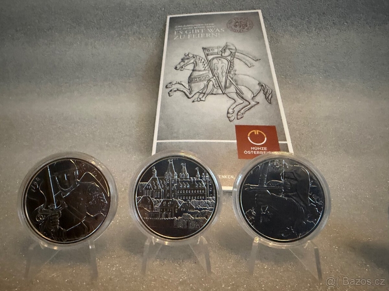 tři stříbrné mince 1oz vydané Vídeňskou mincovnou k výročí 825 let